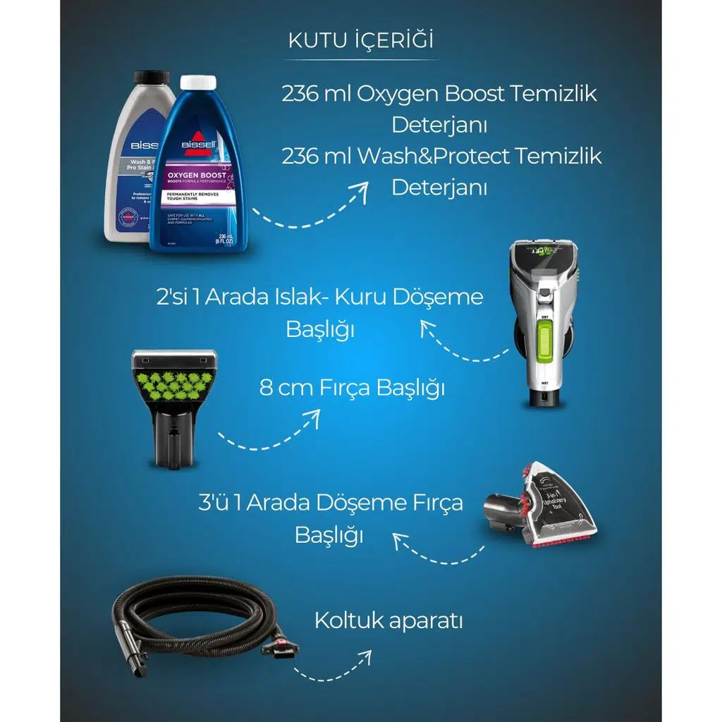 Kutu İçeriği : Makine, 1 adet 8 cm fırça başlığı, 1 adet 2'si 1 Arada Islak-Kuru Döşeme Başlığı, 1 adet 3'ü 1 Arada Döşeme Fırça Başlığı, 1 adet 236 ml oxygen boost temizlik deterjanı, 1 adet 236 ml wash&protect temizlik deterjanı, 1 adet koltuk aparatı