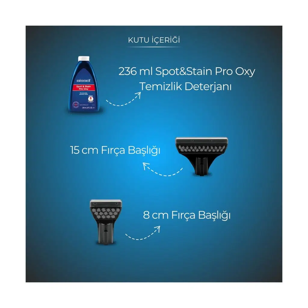Kutu İçeriği : Makine, 1 adet 15 cm fırça başlığı, 1 adet 8 cm fırça başlığı, 1 adet 236 ml Spot&Stain Pro Oxy deterjan